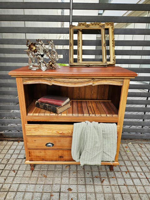 Bahiut fabricado en madera de pinotea recuperada, combinado detalles, molduras y patas en maderas de calidad similar como el cedro (la madera puede reemplazarse por otra de igual calidad, segun disponibilidad).